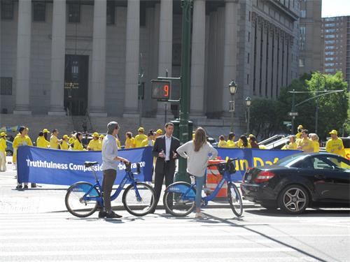 “今天炼功的感觉太好了,过路的美国人反应也很好。”来自德国的法轮功学员法比安·富安德斯(Fabian Fuendes)今年七十三岁,“我很高兴能来纽约参加活动。”