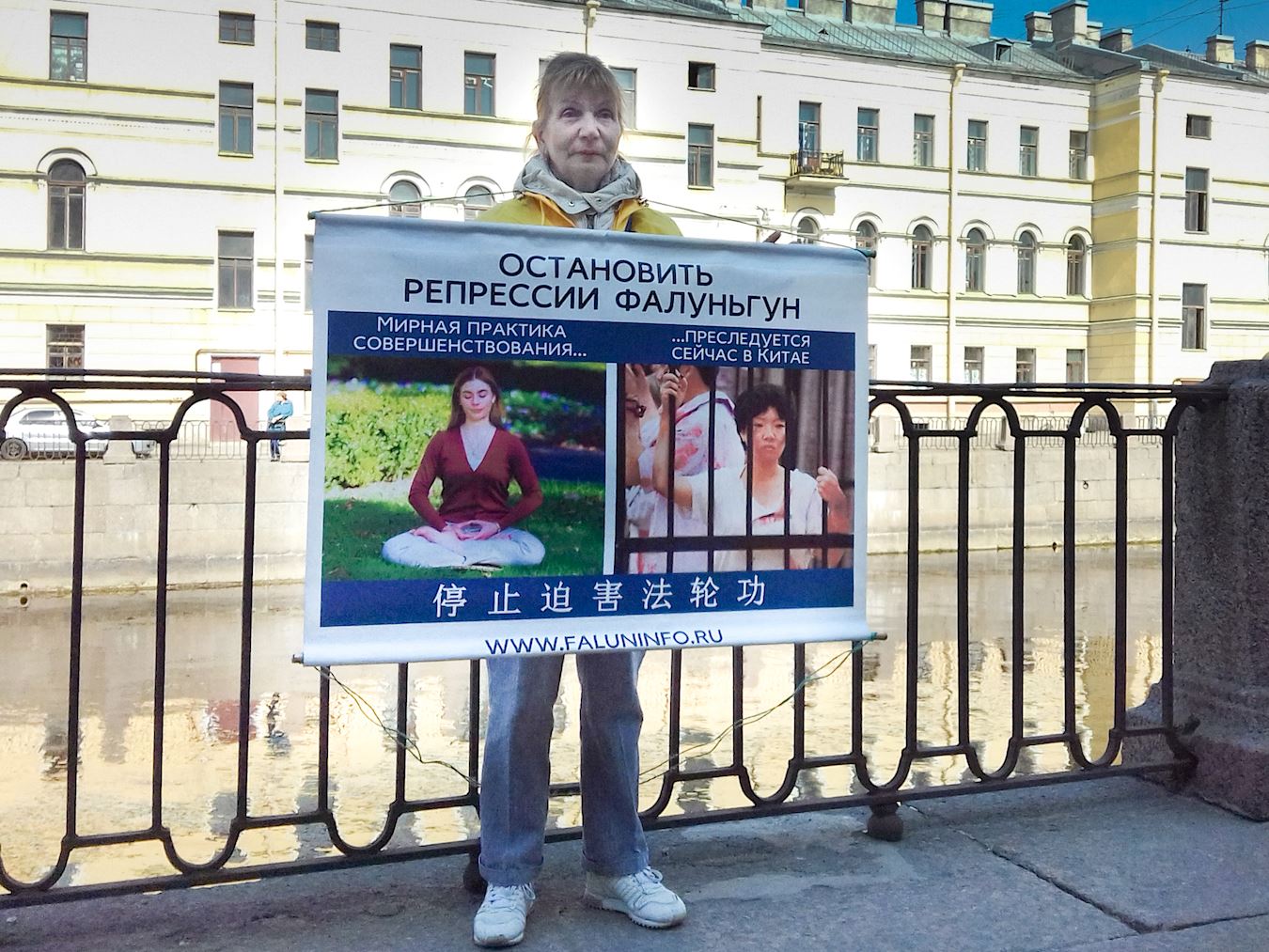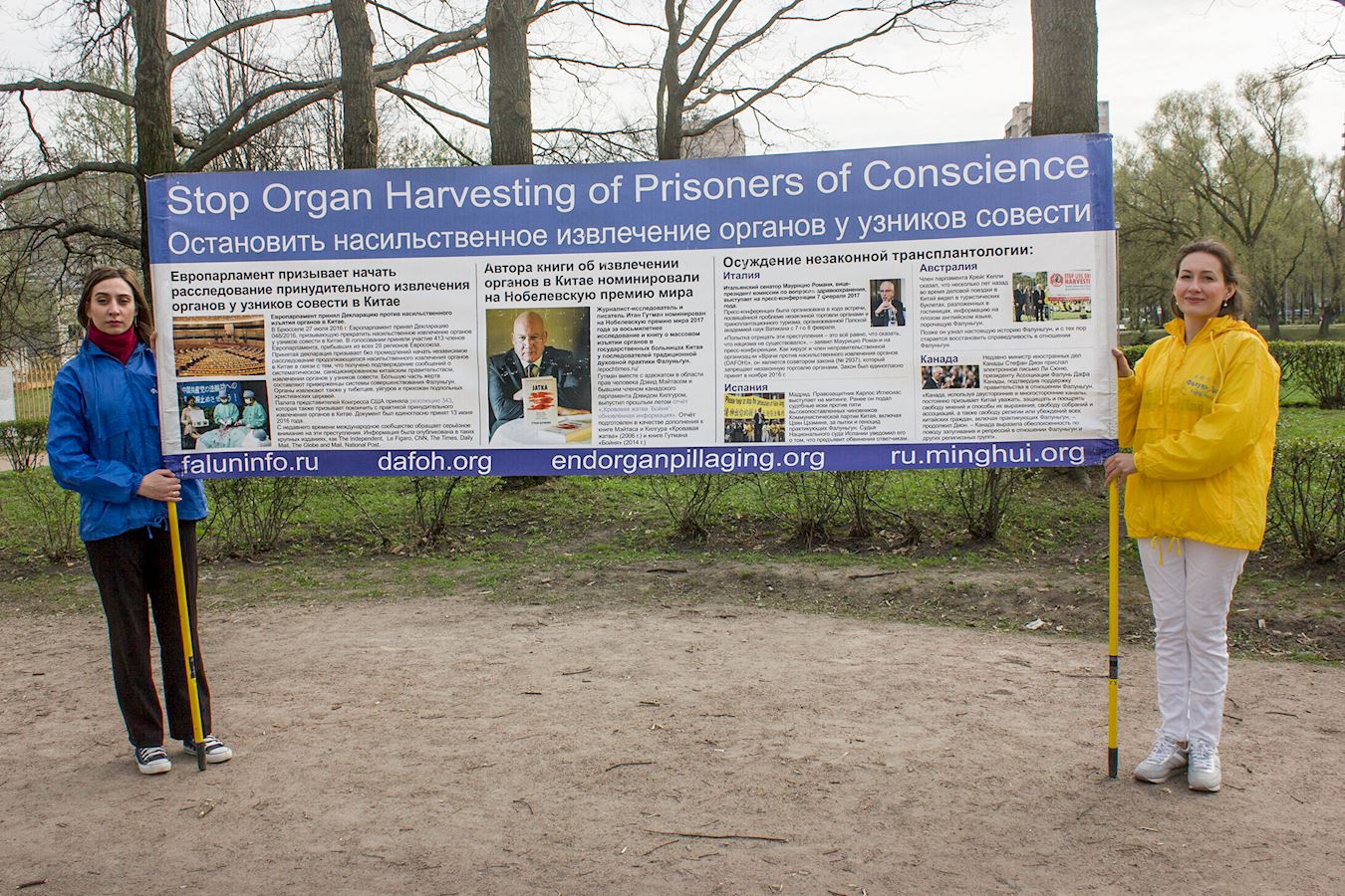 一名骑自行车路过的年轻人停下来,询问活动的原因是什么,说他已经熟悉有关法轮功的信息,听说这是关于迫害持续了二十年的事情,他又停下来走过去看传单。一位年轻女子在展板旁上停了下来,说他们公司里的每个人都阅读了传单,但是他们难以相信在中国居然发生着如此残酷的事情。学员讲到许多国家的议会都在谴责强摘器官这种野蛮行为,并且制定法规阻止器官移植旅游。这些真相信息使这位女子信服,离开时,她希望圣彼得堡的法轮功学员获得成功和力量。