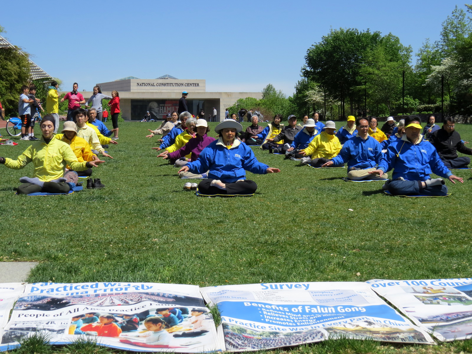 ![]() 图1:2019年4月27日,部分大费城地区法轮功学员在自由钟附近草坪上以集体炼功纪念四·二五和平上访二十周年。 |