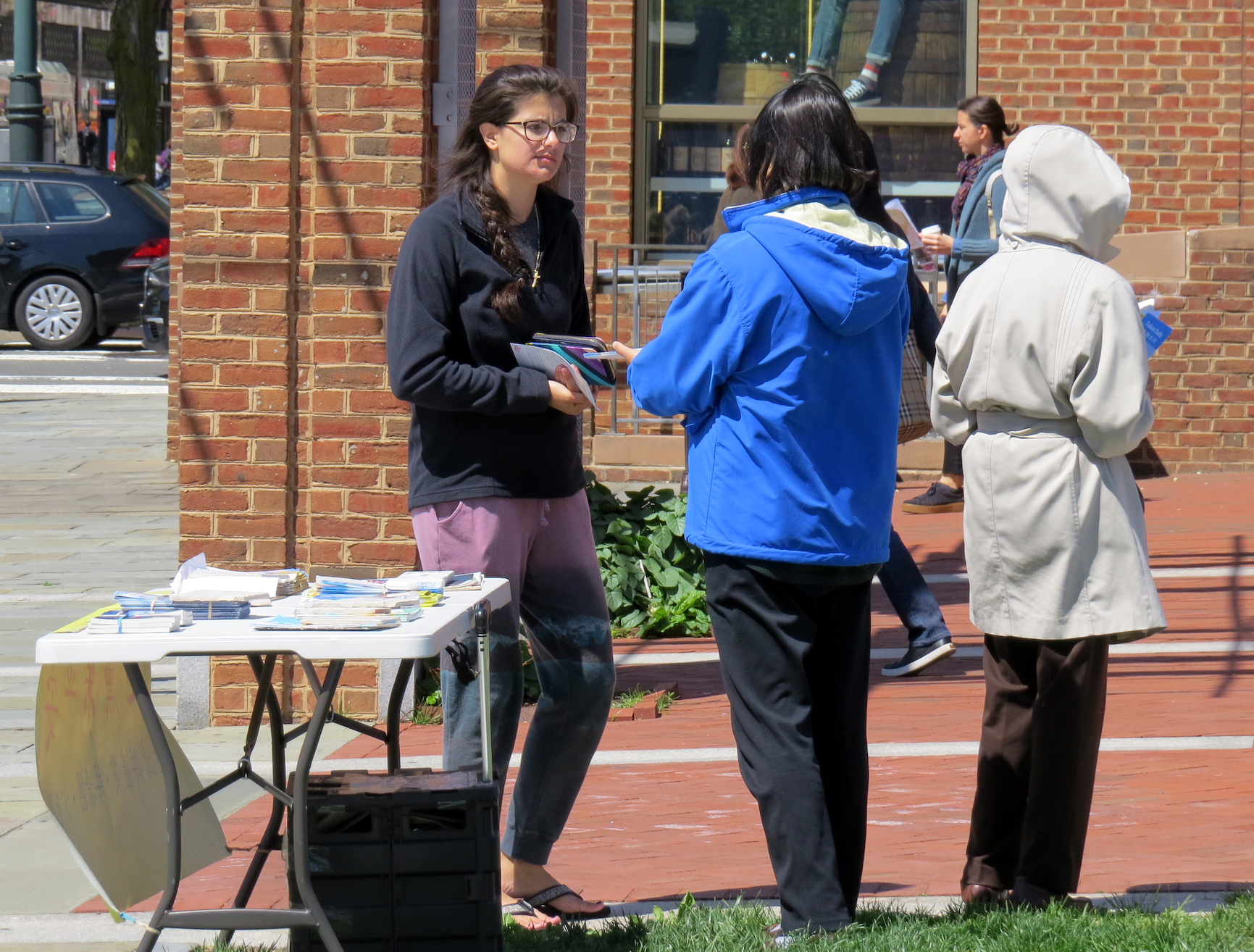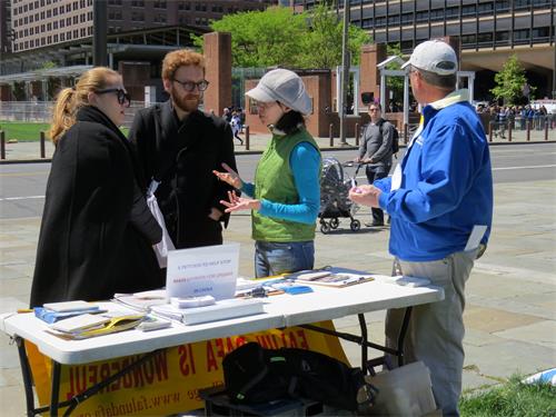 通过介绍法轮功真相的横幅、展版等,以及与法轮功学员交谈,来著名景点参观自由钟的众多游客了解到了法轮大法的美好和中共对法轮功的残酷迫害。