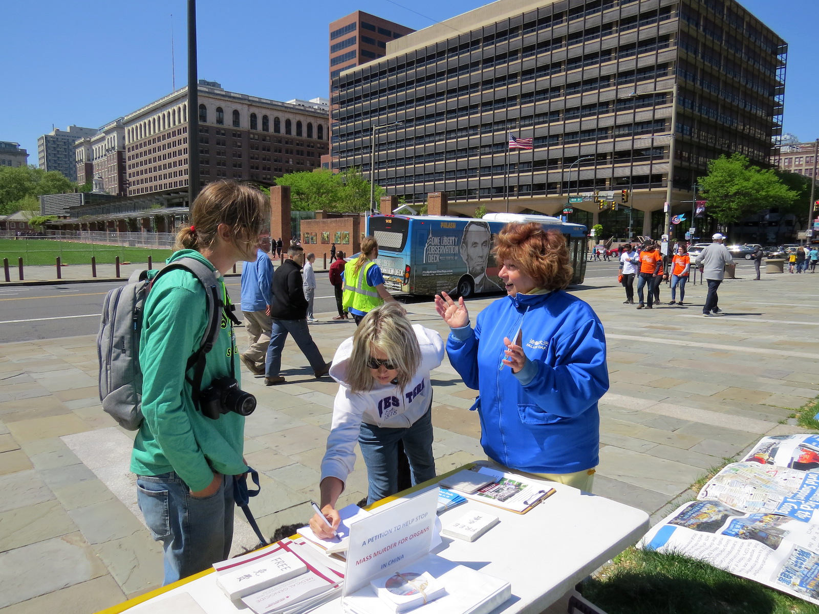 康州的苏珊(Susan)在一周前听费城读书的女儿告诉她曾经在自由钟附近看到一批人在打坐,而且他们还有个名字叫做法轮大法。因此,苏珊这次来看女儿时就特意地到这里来转一转,结果真得碰到了学员们在炼功,心里十分高兴。她在签名反迫害后感谢学员们努力,“你们这样做很重要,要告诉更多人的这些事情。”