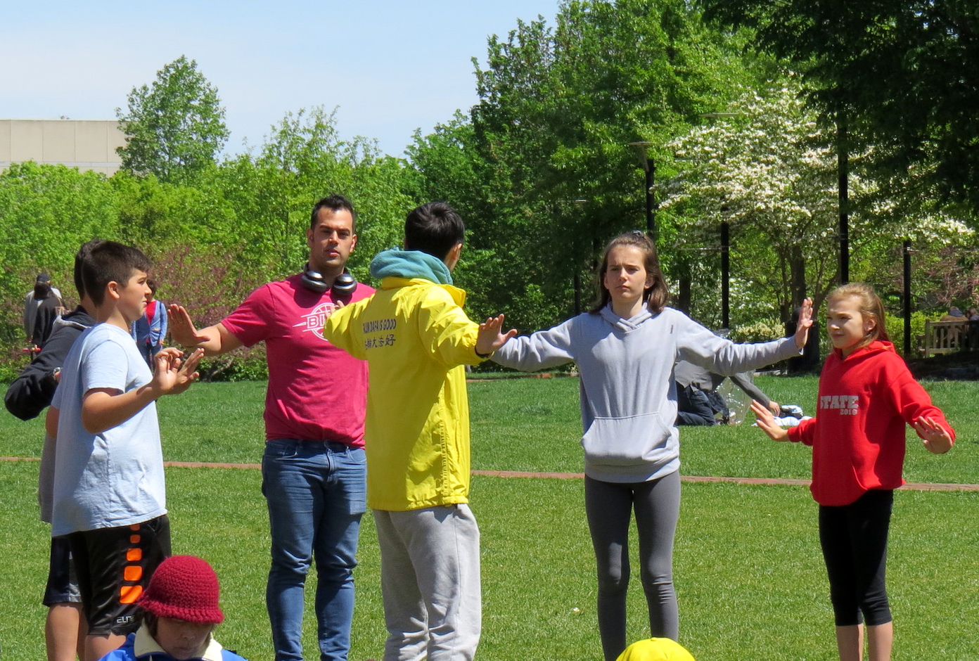 学员们安静的打坐也让不少人对炼功产生了兴趣。当费城居民阿利(Alley)与朋友们骑车经过时,停下来表示想学炼功法。在一位年轻学员的帮助下,他们学了约半小时的功法。阿利说他感到放松,内心很平静。他对在中国发生的迫害理解,希望这场悲剧早日结束。