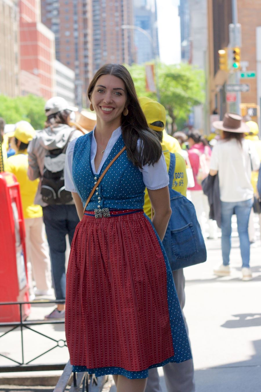 来自瑞士德语区的路特·乌尔里希(Ruth Ulrich)女士身穿瑞士传统民族服装参加游行,“今天感觉真的很好,散发着不可思议的强大的能量场。能参与其中很美妙,还可以穿上我们的民族服装。”她表示,来纽约参加法轮大法日的活动,能和全世界法轮功学员在一起,非常好的体验。能够来纽约向全世界讲述法轮大法好、法轮功反迫害的真相,乌尔里希觉得这非常重要,“这非常重要,也是我们来此的目的。”