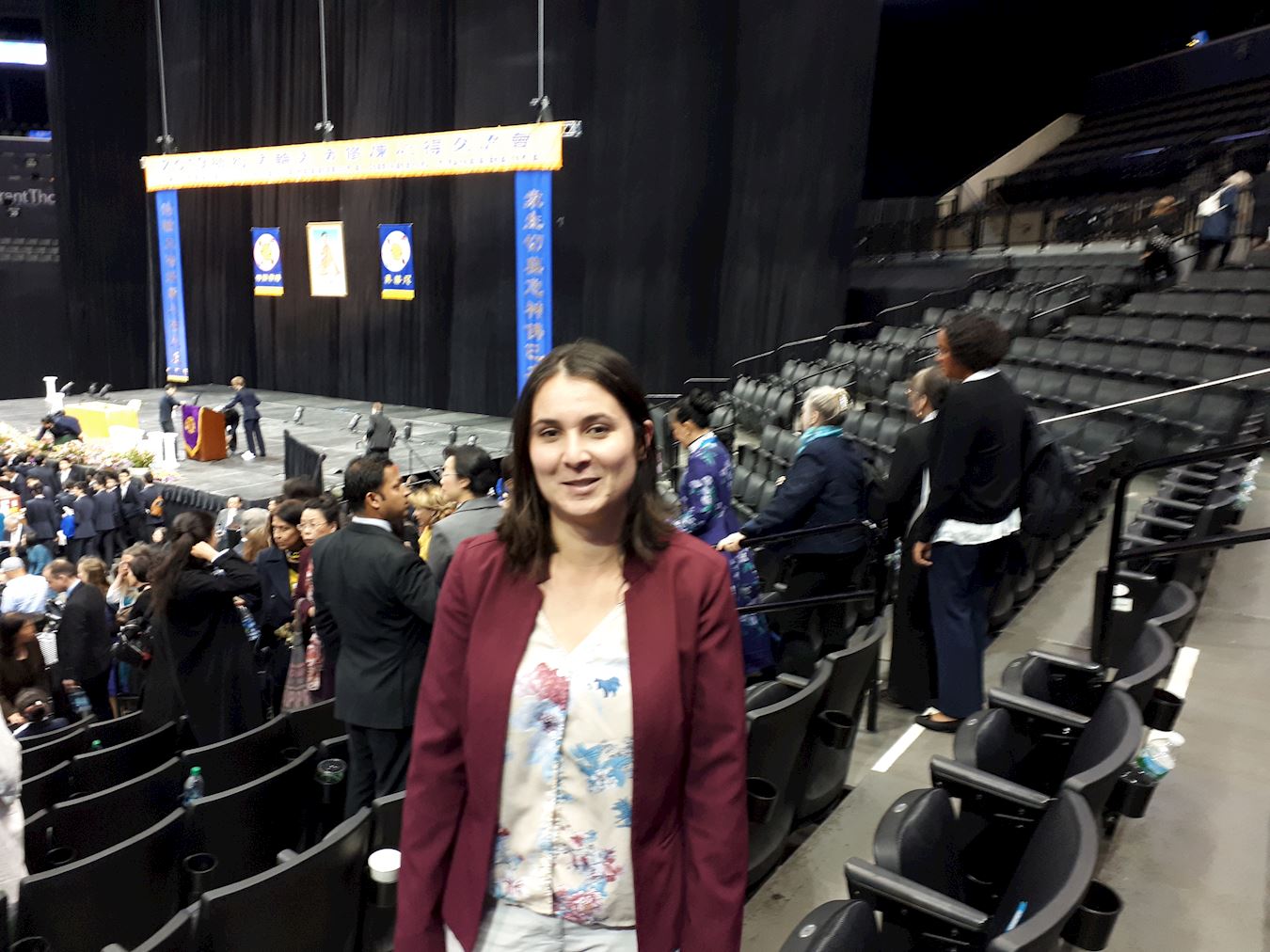 图5:法国青年大法弟子卡密尔(Camille Avias)在二零一九年纽约法会上。她说:“这是我第一次见到师父,我感到非常幸福。”