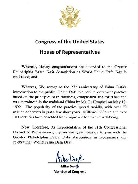 宾州国会众议员道尔(Mike Doyle)在褒奖信中说,“法轮大法是一种基于‘真、善、忍’普世价值的自我提升的修炼方法,于1992年5月13日由李洪志先生在中国大陆传出。中国以及世界上其它100多个国家的亿万民众从法轮大法中身心受益。”“作为宾夕法尼亚州第十八区的国会议员,我很荣幸的与大费城地区法轮大法学会一同庆祝‘世界法轮大法日’。”