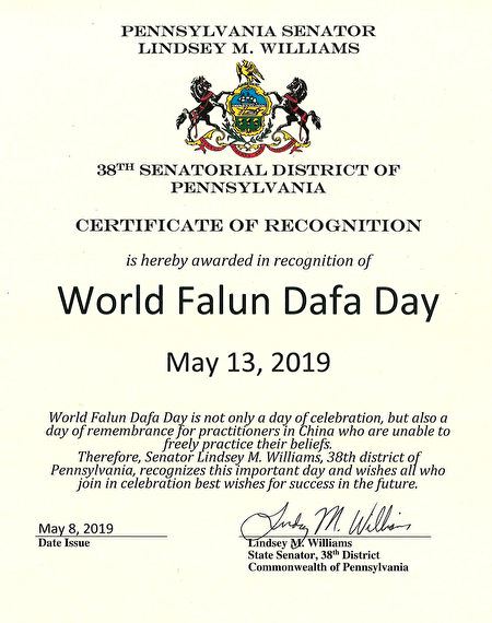 宾州州参议员威廉姆斯(Lindsey M. Williams)在褒奖信中说,“世界法轮大法日不仅仅是一个庆祝日,更是为纪念那些在中国大陆不能自由修炼的人们。鉴于此,州参议员威廉姆斯(Lindsey M. Williams)特此嘉奖这个重要的日子,并祝愿所有参与这个庆祝活动的人都有一个光明的未来。”