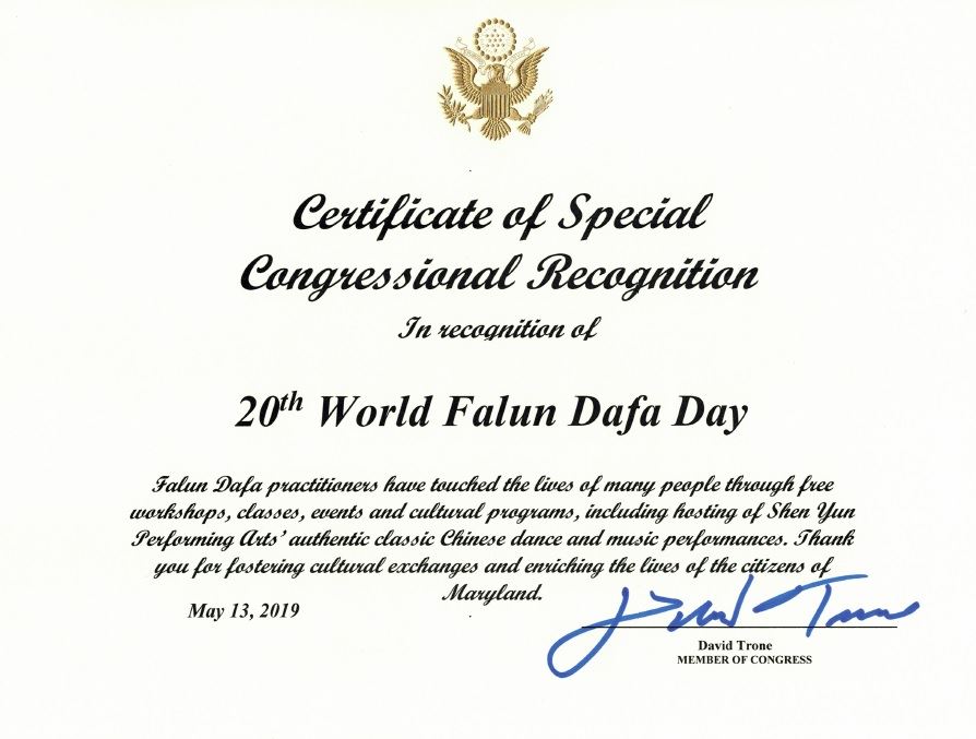【明慧网二零一九年五月二十三日】美国马里兰州联邦众议员戴维·特朗(David Trone)为第二十届世界法轮大法日颁发了国会特别褒奖。