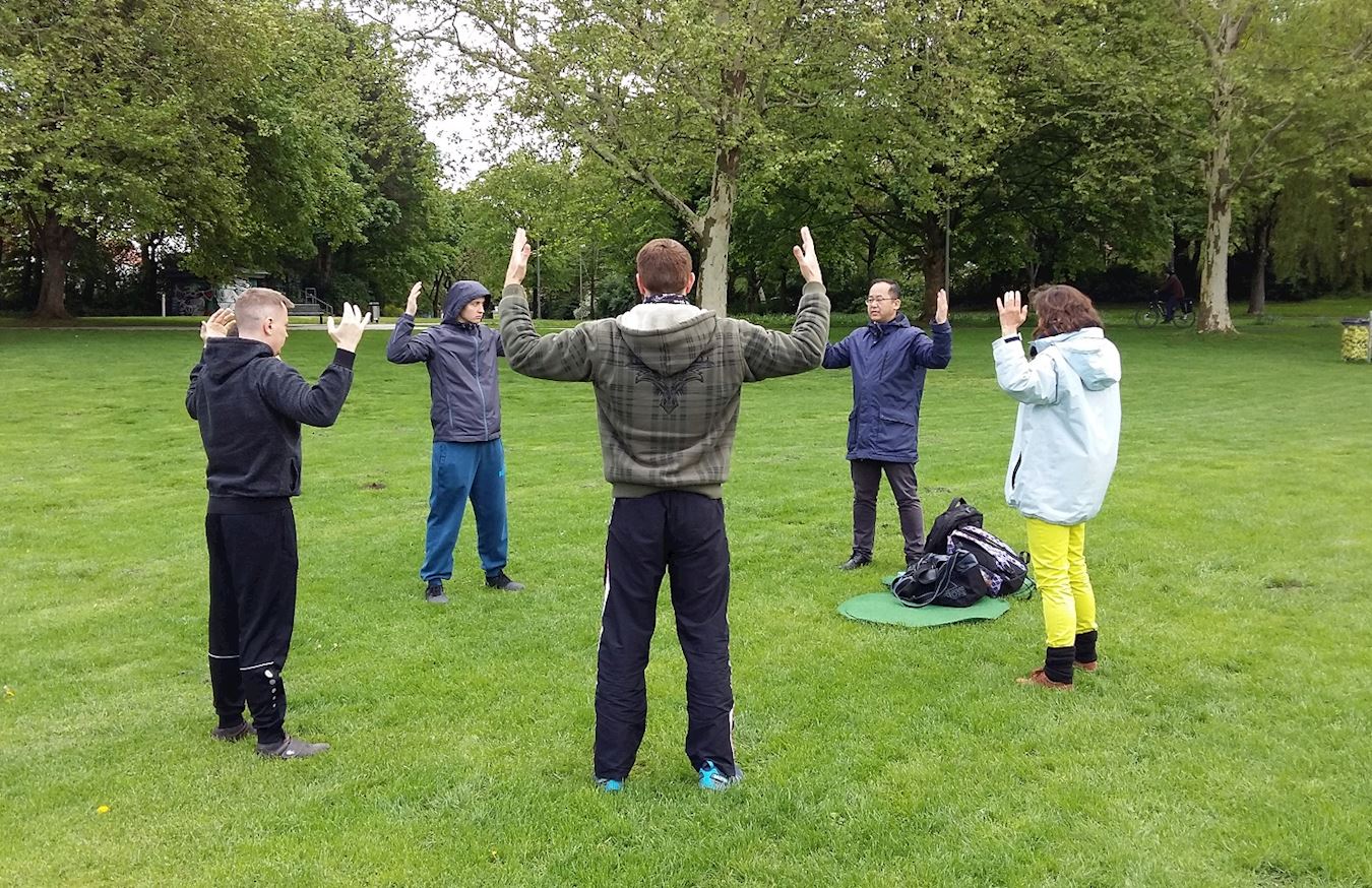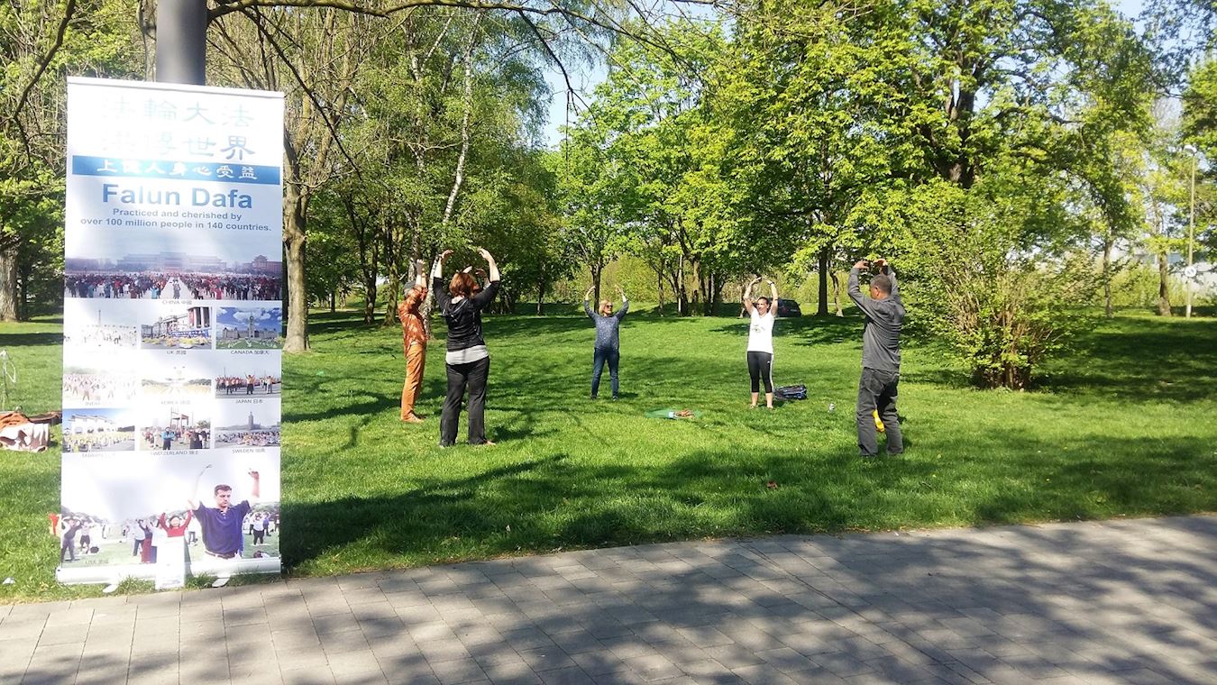 在两小时内,法轮功学员们向参加者展示了法轮功的五套功法,比如“佛展千手法”和“法轮桩法”,第五套功法需要双盘打坐。法轮功可以让身体的产生能量,净化身体,并使身体更健康。法轮功在中国曾经有八千万人炼法轮功,后来被中国政府禁止。