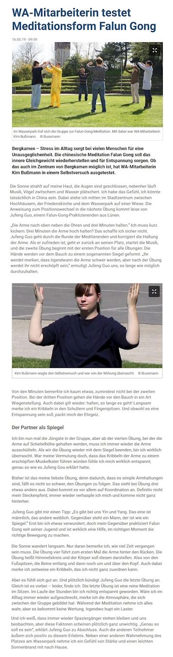 《威斯特法伦日报》也是拥有了一百六十九年的百年报纸(1850年建报),该报记者珂姆·布施曼(Kim Bussmann)女士也体验了法轮功的炼功,炼功后她惊喜的表示“浑身充满了能量”。后她撰写名为《威斯特法伦日报记者体验炼法轮功》文章。
