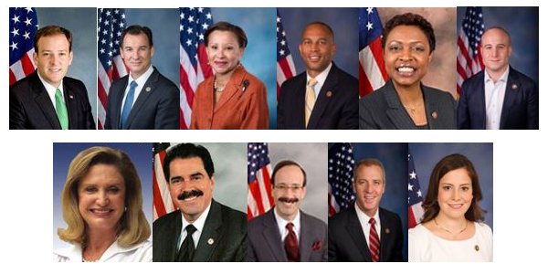 图:从左至右,从上至下,分别是纽约州第一选区国会议员李·米泽尔丁(Lee m. Zeldin),第三选区国会议员托马斯·苏瑞(Thomas R. Suozzi),第七选区国会议员纳迪亚·委拉斯开兹(Nydia M. Velazquez),第八选区国会议员杰弗里斯(Hakeem Jeffries),第九区国会议员伊薇特·克拉克 (Yvette Clarke) ,第十一区国会议员马克斯·罗斯(Max Rose),第十二选区国会议员卡罗琳·马洛尼(Carolyn B. Maloney),第十五选区国会议员国会议员何塞·塞拉诺(Jose E. Serrano),第十六选区国会议员艾略特·恩格尔(Eliot Engel),第十八选区国会议员肖恩·帕特里克·马洛尼(Sean Patrick Maloney),第二十一选区国会议员爱丽丝·斯特凡尼克(Elise M. Stefanik)