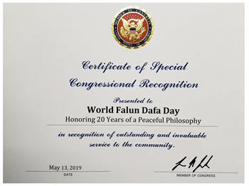 鉴于,我们很自豪地祝贺于二零一九年五月十六日至十八日举行的第二十届世界法轮大法日的庆祝活动;并且