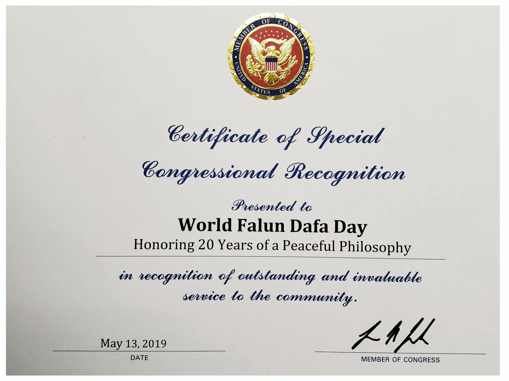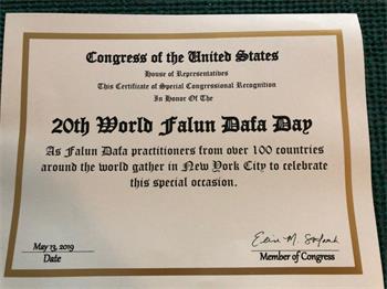 【明慧网二零一九年五月二十六日】二零一九年五月十三日是第二十届“世界法轮大法日”,五月九日至五月十八日,纽约及来自世界各地的万名法轮功学员以多姿多彩的文艺表演、大游行、盛大排字等多种方式庆祝这个神圣的节日。纽约州各级政要也发出上百份褒奖表示祝贺。其中十一位国会议员发来褒奖贺信,恭贺大法弘传世界二十七周年暨第二十届世界法轮大法日。