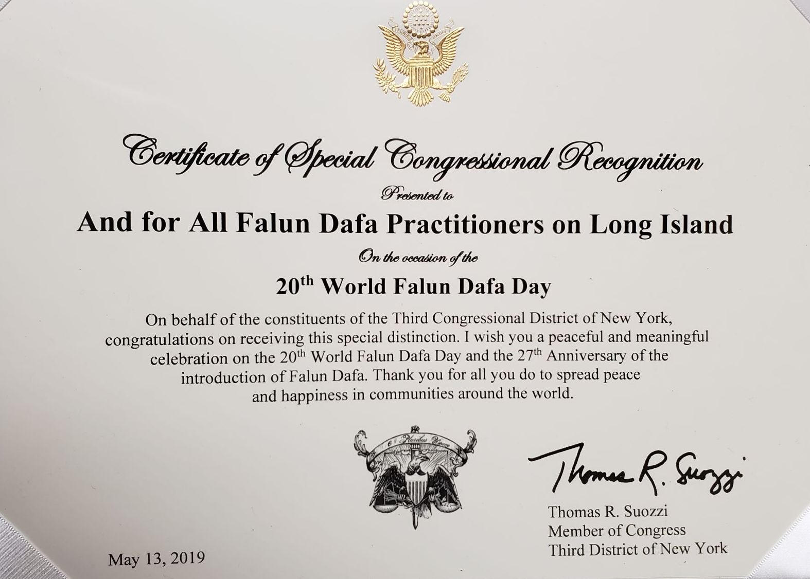 纽约州第三选区国会议员托马斯·苏瑞(Thomas R. Suozzi)发来荣誉证书褒奖“法轮大法日”,并祝愿第二十届世界法轮大法日的庆祝活动和大法洪传二十七周年,感谢法轮功学员把和平与幸福带到世界各地。