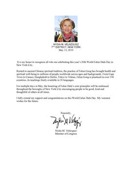 国会议员纳迪亚·委拉斯开兹(Nydia M. Velazquez)发来贺信,祝贺大法日