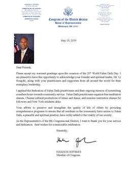 国会议员哈基姆·杰弗里斯(Hakeem Jeffries)发来贺信,感谢法轮大法创始人李洪志先生