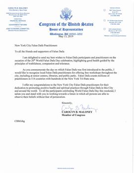 国会议员卡罗琳·马洛尼(Carolyn B. Maloney)发来贺信,祝贺大法带给人类健康和精神上的升华
