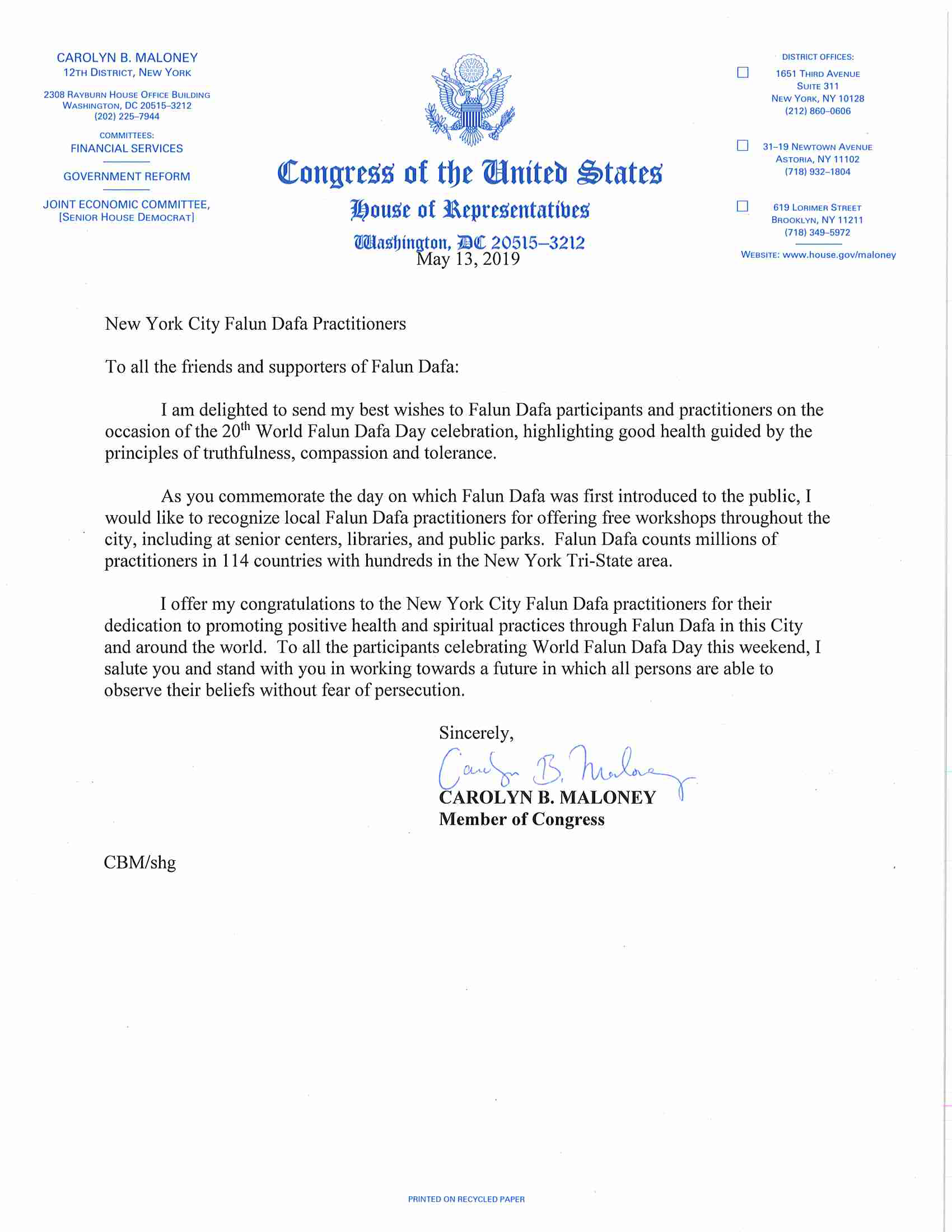 纽约州第十二选区国会议员卡罗琳·马洛尼(Carolyn B. Maloney)发来贺信,表示:“在第二十届世界法轮大法日庆祝活动之际,我很高兴向法轮大法及其修炼者致以最美好的祝愿,特别祝贺他们以真善忍为原则而带来的良好健康”。