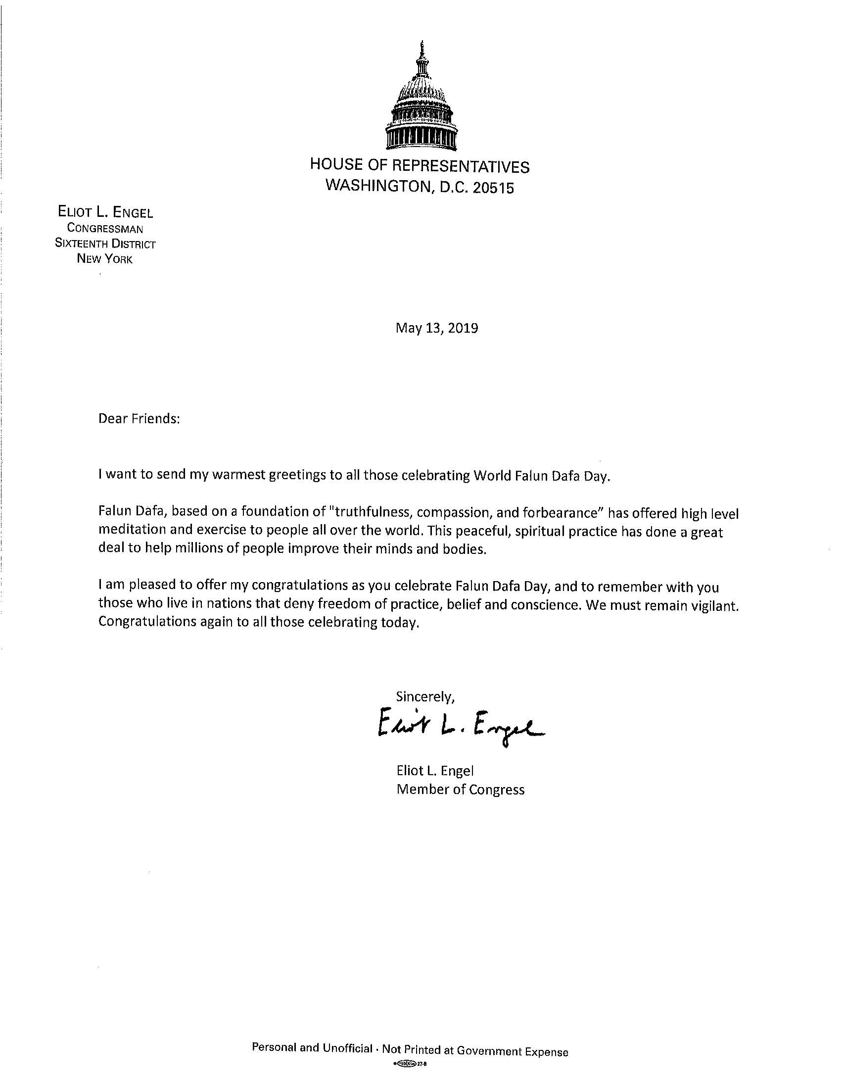 纽约州第十六选区国会议员艾略特·恩格尔(Eliot Engel)发来贺信,表示:“我要向所有庆祝世界法轮大法日的人致以最热烈的问候。”
