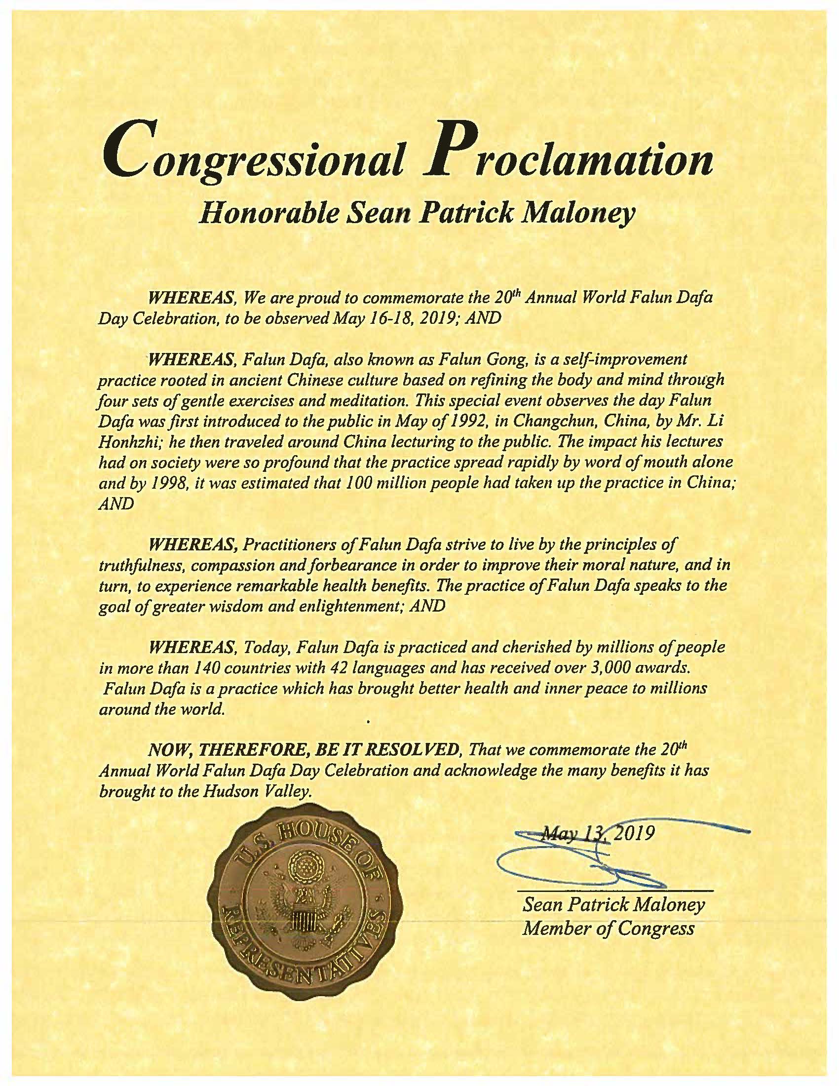 纽约州第十八选区国会议员肖恩·帕特里克·马洛尼(Sean Patrick Maloney)发来褒奖,赞颂法轮大法。