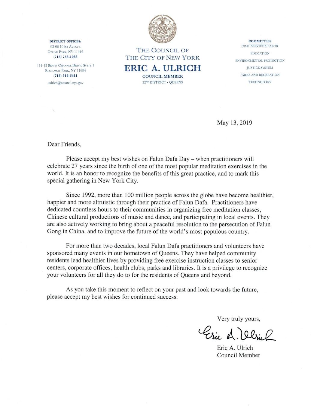 纽约市第三十二选区市议员埃里克·乌尔里希(Eric A. Ulrich)在信中写道: