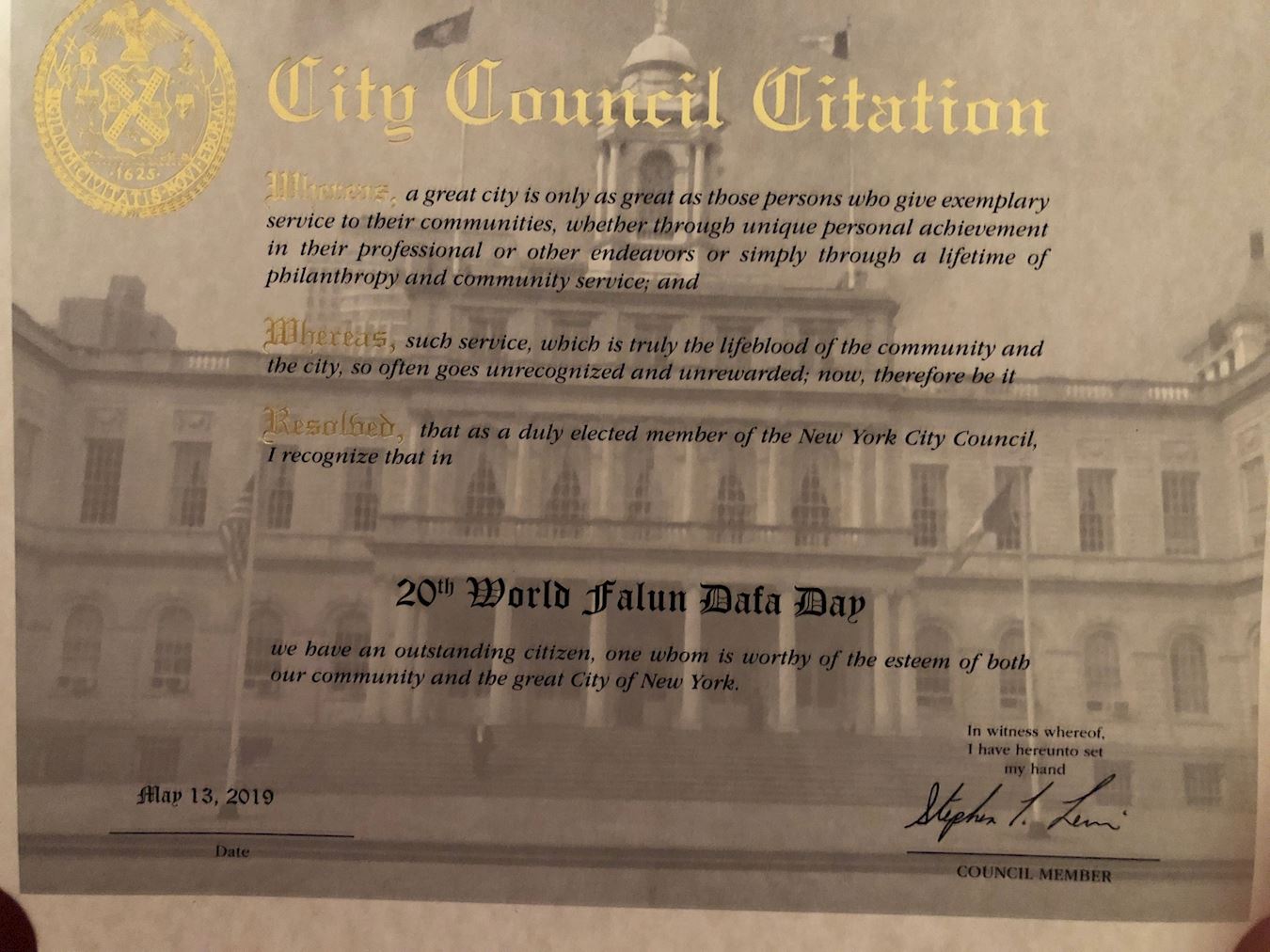 ![]() 图5:纽约市第三十三选区市议员斯蒂芬·莱文(Stephen T. Levin)发来荣誉证书祝贺“第二十届世界法轮大法日”。 |