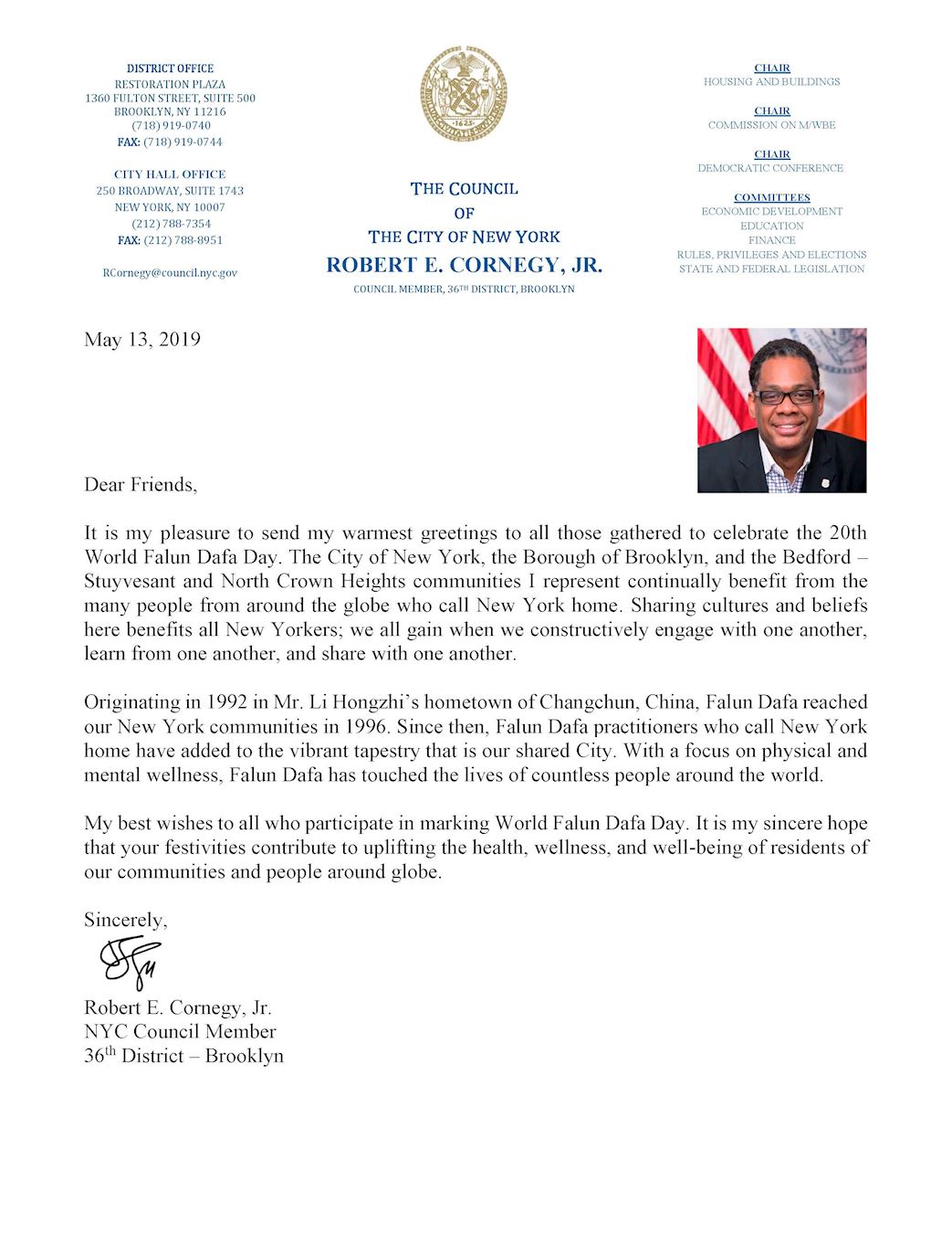 ![]() 图6:市议员小罗伯特·科内吉(Robert E. Cornegy, Jr.)发来贺信,感谢大法活动使社区受益。 |