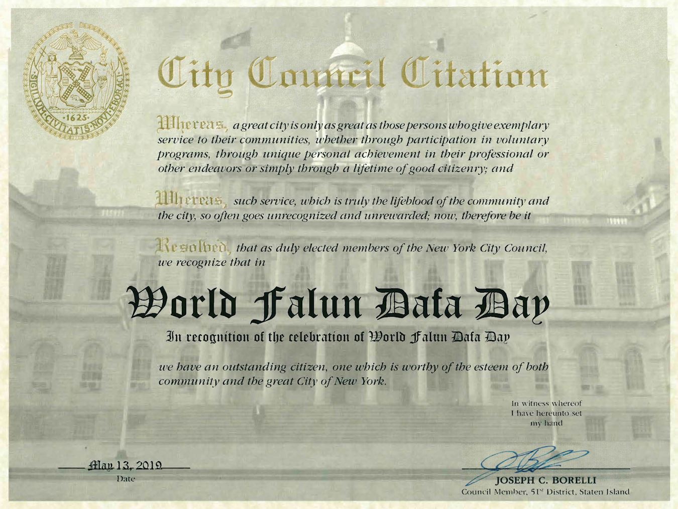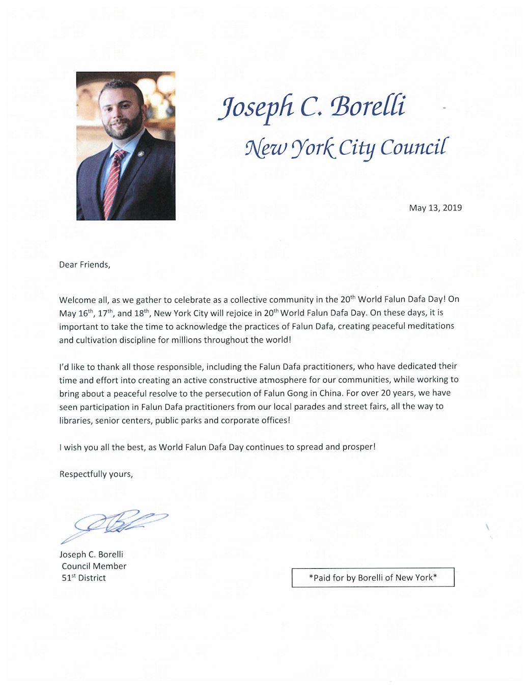 ![]() 图9:市议员约瑟夫·博雷利(Joseph C. Borelli)发贺信,鼓励更多人了解法轮大法。 |