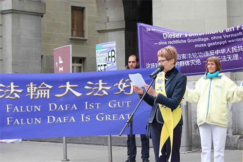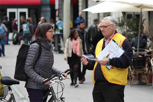 测量技师萨布丽娜(Sabrina)在听完学员详细的介绍后,签名要求制止中共迫害法轮功。她认为:“(迫害法轮功)这是一场灾难,就如同二战,如同当年基督徒被迫害一般,这种对正义群体的迫害在当今的社会根本就不应该发生。我觉得实在是太悲哀了,一个如此平和的群体,如此祥和的功法,但是却被(中共)政权迫害,但是我们在瑞士却得不到相关的讯息。怎么能对此听之任之,这实在是太糟糕了。”