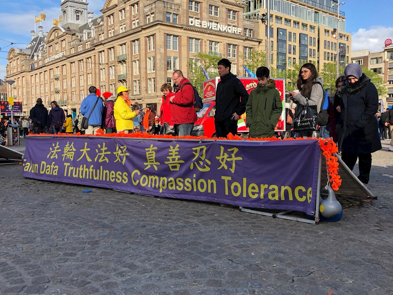 荷兰法轮功学员获准每天在阿姆斯特丹达姆广场举办活动,介绍功法。由于4月27日是荷兰盛大的节日,游客众多,法轮功学员特意询问了荷兰警察是否可以如常举办活动。这位警察立即打电话请示了上级,上级回复:“你们有许可,今天可以正常在达姆广场举行活动。”