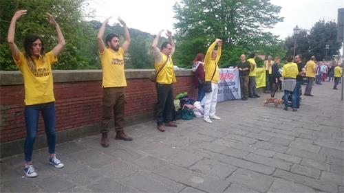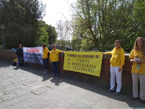 四月二十五日,来自托斯卡纳大区(Toscana)的许多法轮功学员聚集在佛罗伦萨的Lungarno Diaz街道上。这条大街位于佛罗伦萨的历史中心附近,大部份运载游客的大巴都会选择在这里停车。每天会有数千名游客来城市里参观,而且大部份都是旅游团,他们的行程时间都非常紧,所以道路上的行人和车辆一直络绎不绝。