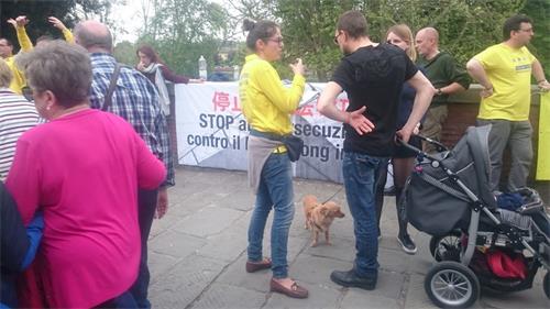 一位被功法演示和炼功音乐所吸引的路人表示想要了解更多信息,他询问了炼功点以及如何学习功法。在得知他家附近普拉托市(Prato)就有设立炼功点以及网上可以找到所有相关信息后表示非常开心。