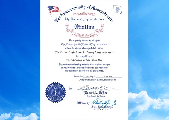 - 美国麻州众议院褒奖 祝贺法轮大法日(图)- 美国麻萨诸塞州众议院议长罗伯特·德里奥于二零一九年五月四日代表众议院全体议员颁发褒奖状,祝贺法轮大法日。