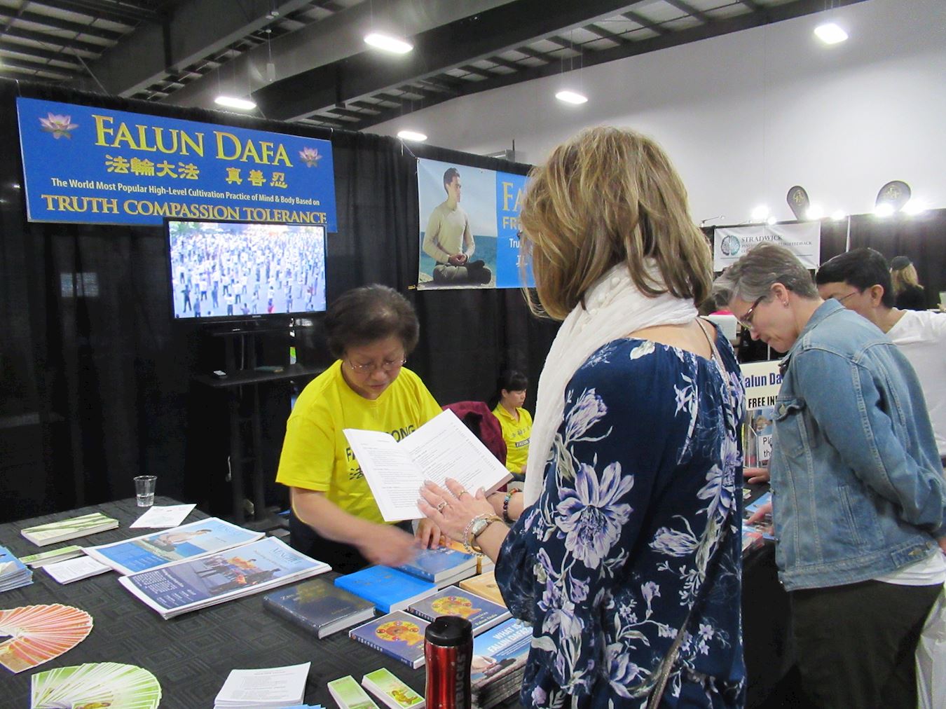 图1:身心健康展上,感兴趣的来宾阅读法轮功书籍。