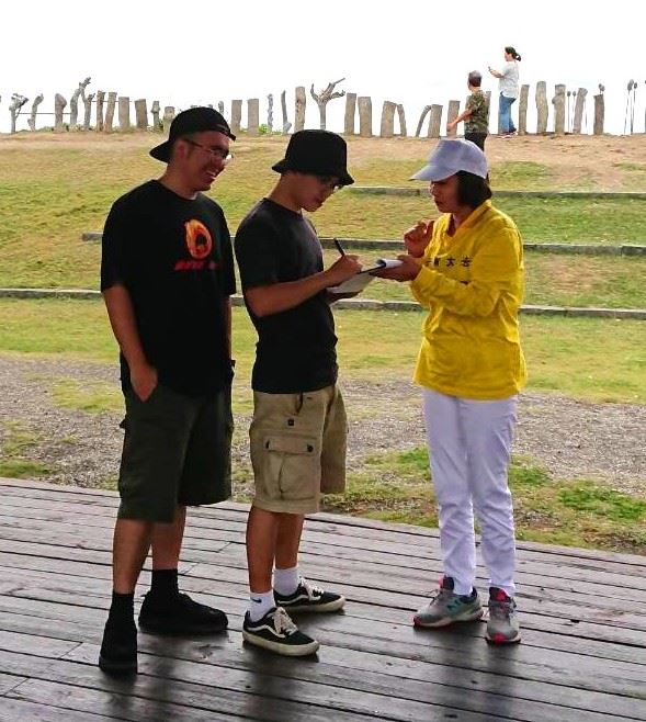 台湾东海岸的加路兰,滨临一望无际的太平洋,自然景观壮阔秀丽,是各地游客旅游东部必经之地。五日上午,天清气朗,海风徐来,浪涛拍岸,自然美景映衬着法轮功学员金黄色上衣,吸引许多游客观赏拍照,其中也有许多大陆游客。