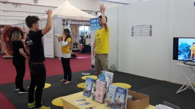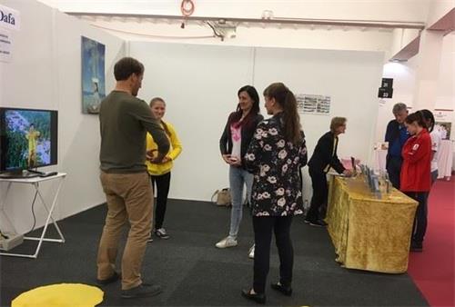 一位中年女子在展台前看功法演示看了很久,当法轮功学员询问她的时候,她说她整个人都沉浸在其中了。周围的其他展台也都能够感受到法轮大法的正的能量。一位旁边展台的工作人员说,法轮大法的正的能量她也能够感受到,功法是如此美丽,她愿意一直看下去。