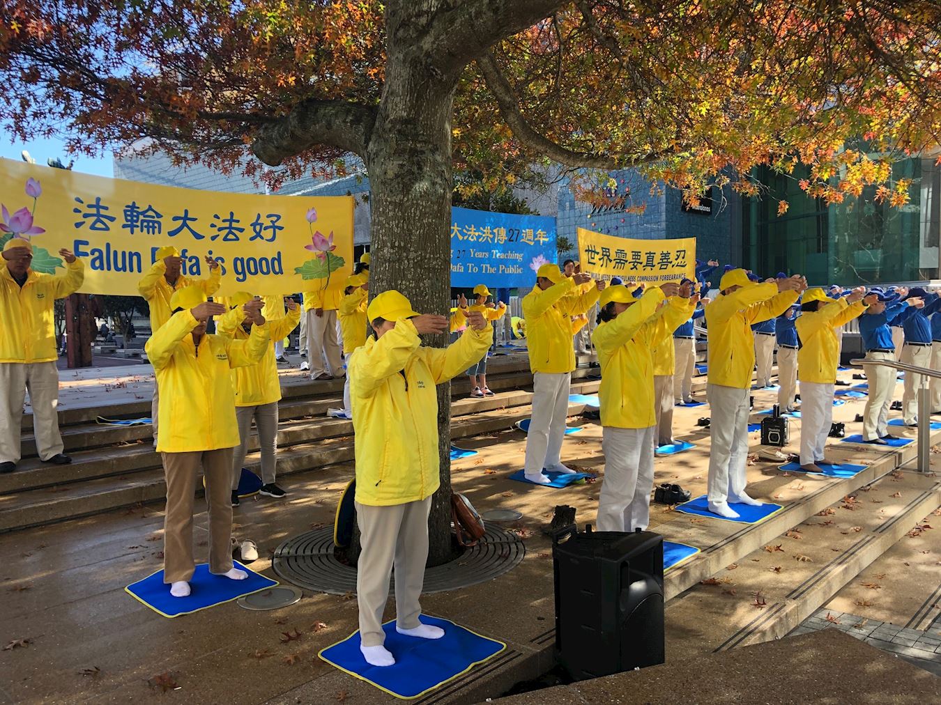 ![]() 图3:法轮功学员在奥克兰市中心天空城炼功,讲真相 |