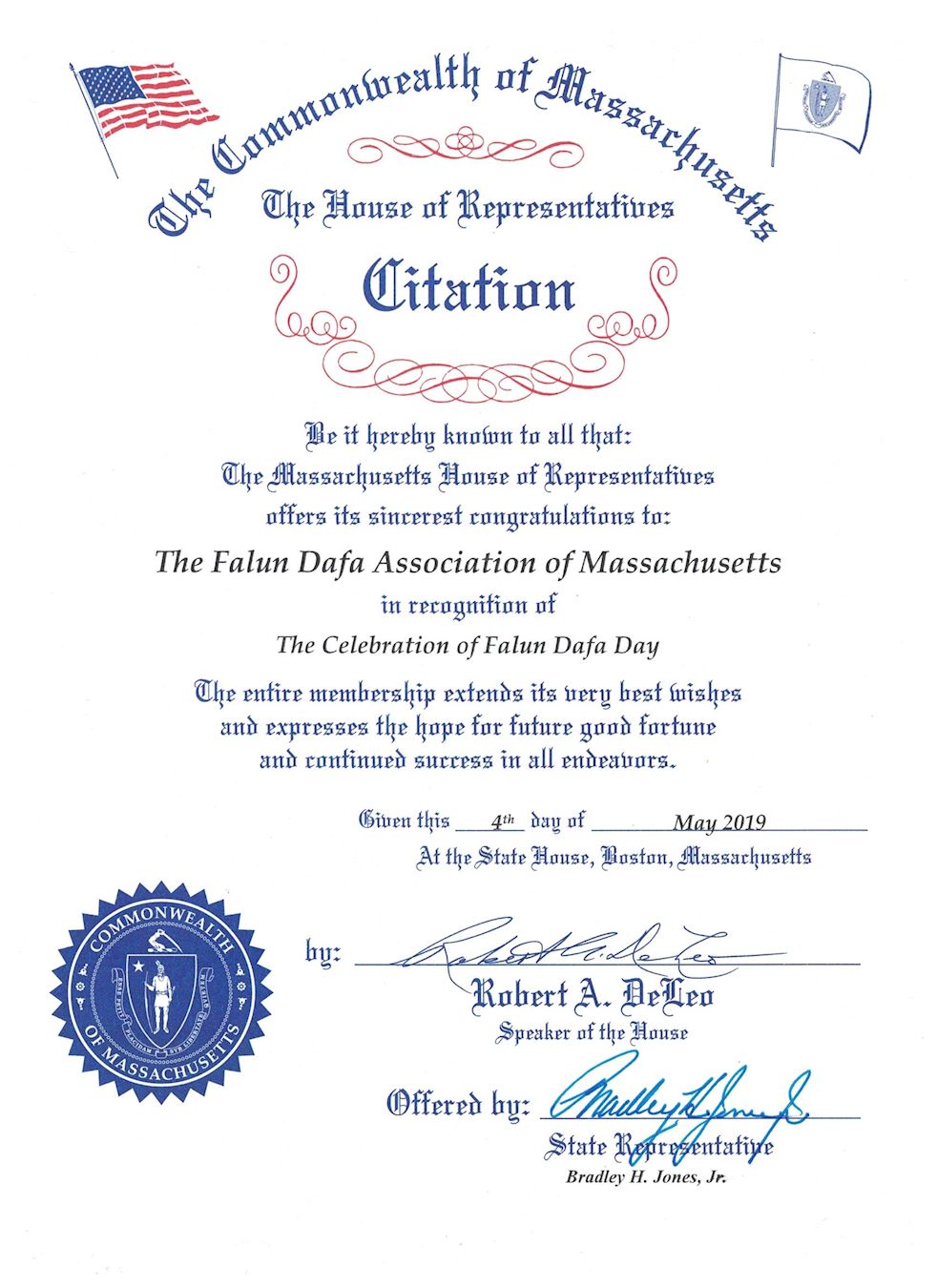 褒奖状中说,麻萨诸塞州众议院向麻萨诸塞州的法轮大法学员们致以最诚挚的祝贺。众议院全体议员向你们致以良好的祝愿,并祝福你们未来继续好运、成功。