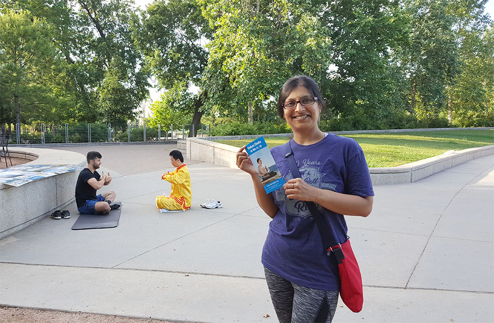 路人阿陆娜(Aruna)是一位财务分析师,以往每个周末来公园练瑜伽,这个星期日,她第一次看到法轮功学员在湖边炼功,以群组方式展示功法,场景祥和美好,感到震撼,她表示:想来修炼真善忍,学打坐,得到身心平衡。很久以前,她的一位中国朋友向她介绍法轮功,当时她了解甚少,现在想了解法轮功的内涵,也想找一份好的工作,带更多人来学功。