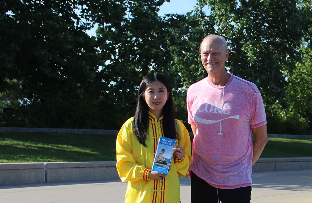 法轮功学员郝女士和李先生向路人约翰先生(John)介绍法轮功,并且弘传一百多个国家,上亿人在修炼,约翰先生是一位安全工程师(safe engineer),他表示:(法轮功弘传世界)很好,每个人都将继续(修炼)。当他得知法轮功学员 在中国遭受迫害时,他感到难过。同时,法轮功的打坐炼功吸引着他,当场他要求学功,学员李先生教他炼功动作,学完后,又加入到学员炼功队伍中去,跟着炼功音乐节奏做。他感到肩膀放松了,身体很舒服、和谐。学员李先生教他上法轮功网站,在网上跟随免费教功录像学功,免费阅读法轮功书籍,他打算下周带朋友一起来学功。