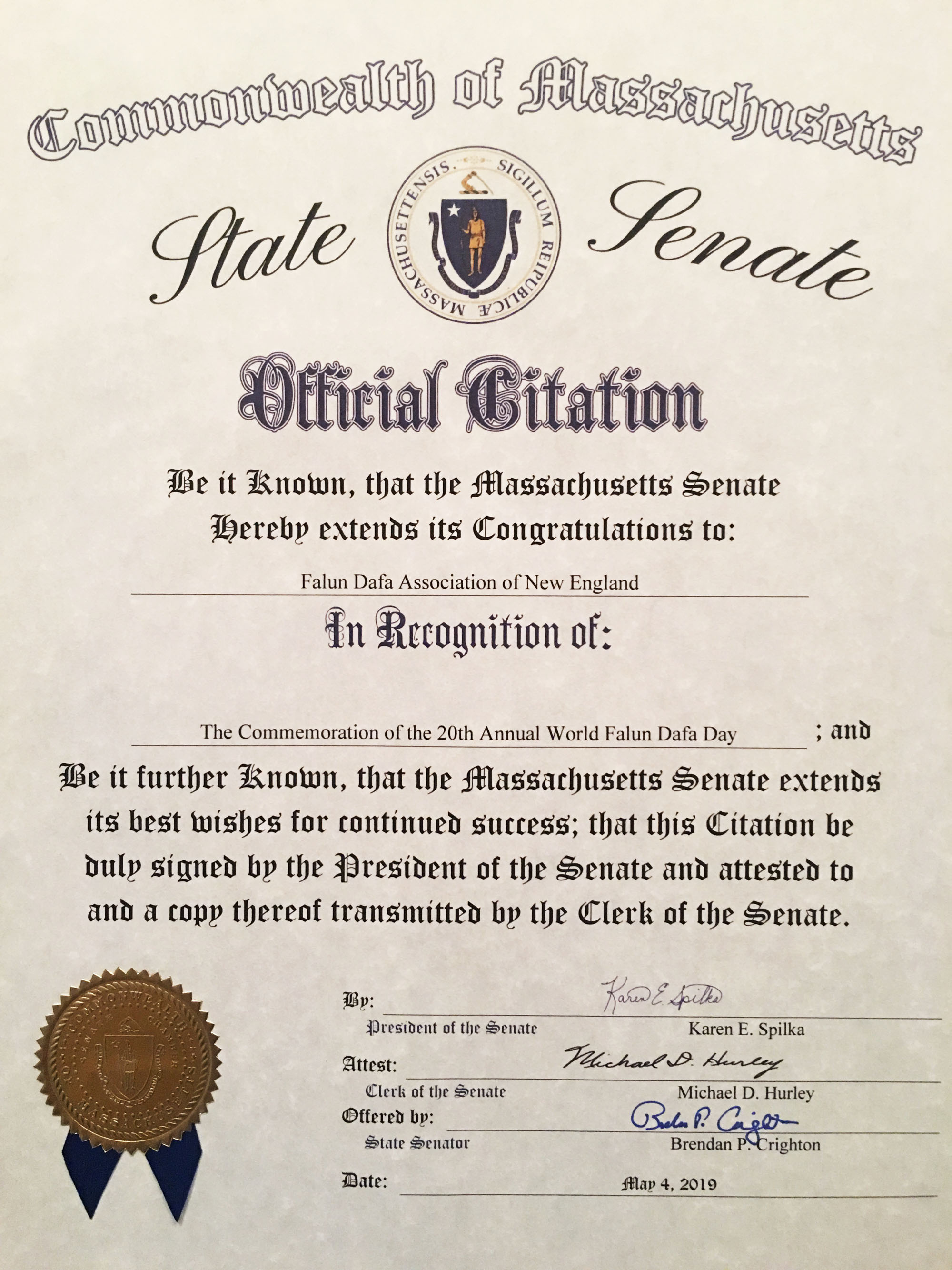 褒奖状中说,值此二零一九年世界法轮大法日之际,麻萨诸塞州参议院谨向新英格兰法轮大法学会表示祝贺。麻萨诸塞州参议院并祝法轮大法学会继续成功!