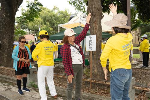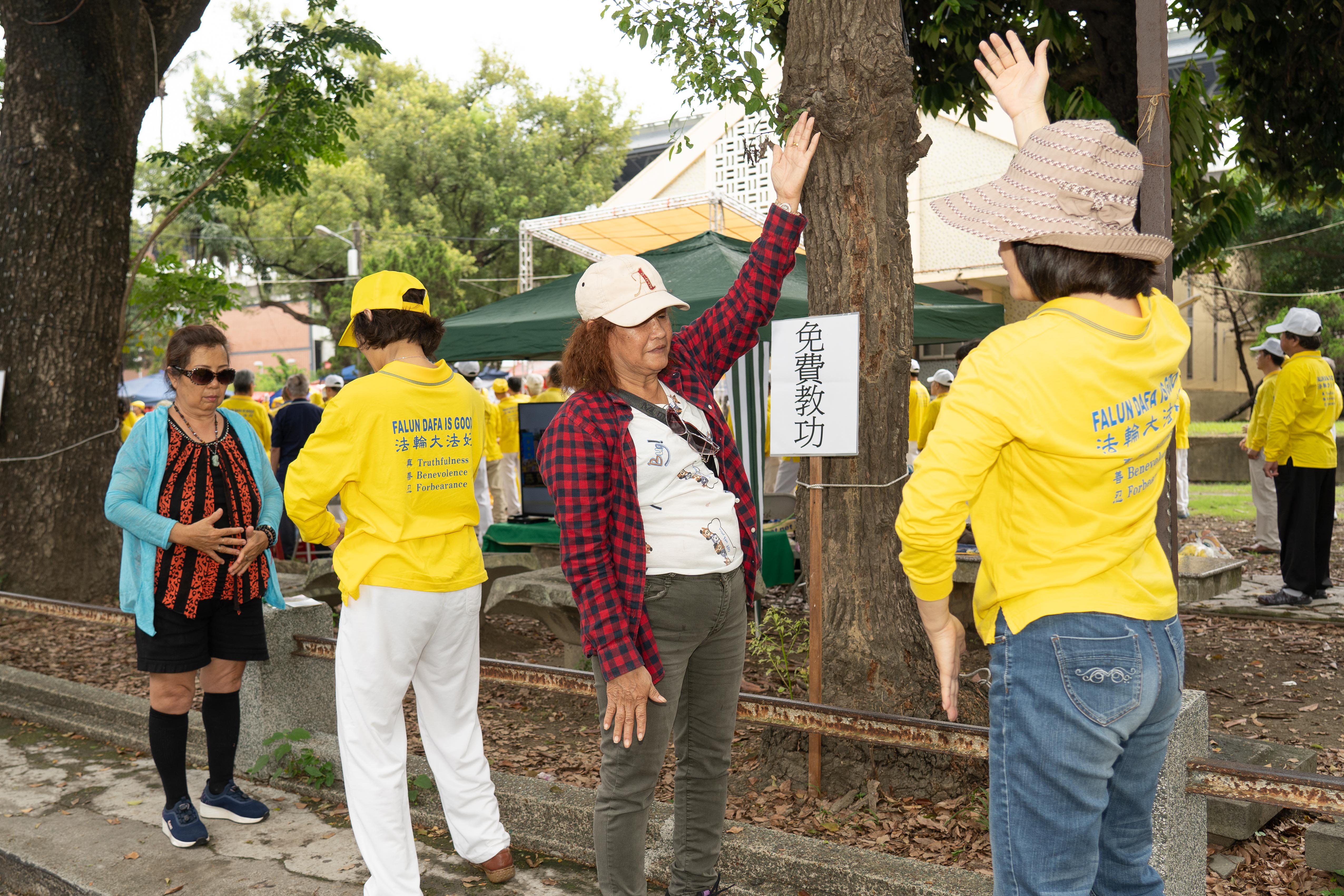 庆典上,有欢快喜庆的腰鼓表演、优雅温婉的青年学子乐曲演奏、祥和优美的法轮功功法展示、民众学功区以及真相展板,多位议员、里长莅临现场表示支持,向过往民众介绍高德大法的美好,很多游客现场学功、并拿取莲花和真相传单。