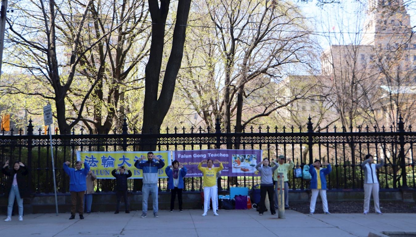 集体拍完照,在市政厅大楼的左侧就看到了法轮功学员在炼功的场景。这个是多伦多九九年反迫害开始后建立的第一个真相点,二十年了,每个周末两天,没有间断过。在香港出生,九六年海外得法的郑女士现在是这个炼功点的协调人,她说:“这是个风雪无阻的真相点,既是连接海外各地来多伦多找我们的大法弟子的落脚点,又是大陆聚集出来的学员能找到多伦多法轮功学员的地方,更是大陆游客来海外能听到真相的地方。”