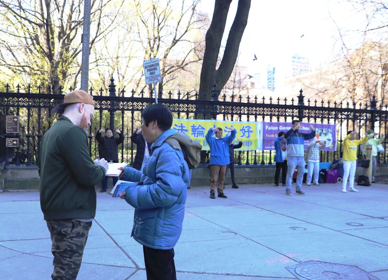 ![]() 图4:郑女士给路人讲真相和征签“停止迫害法轮功” |