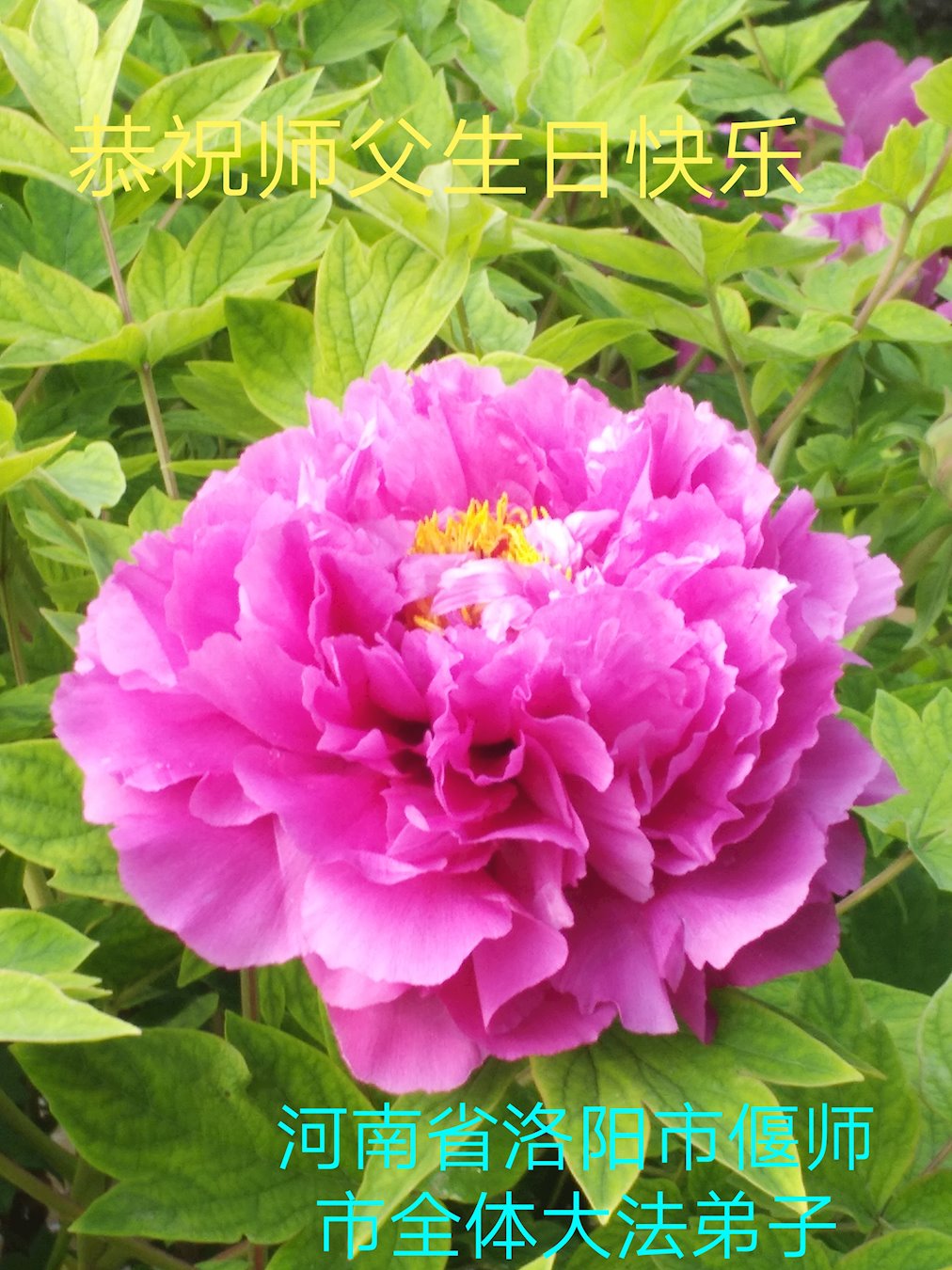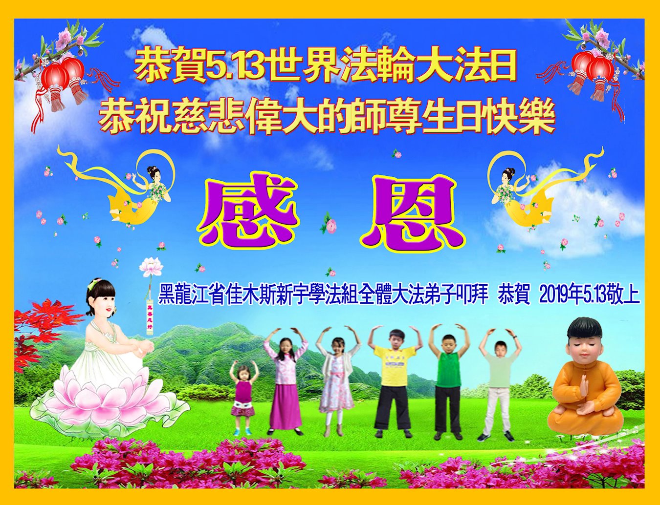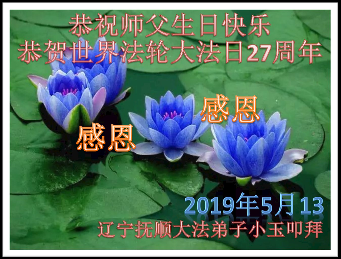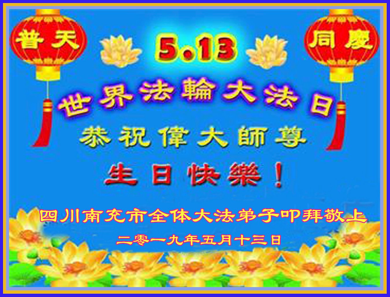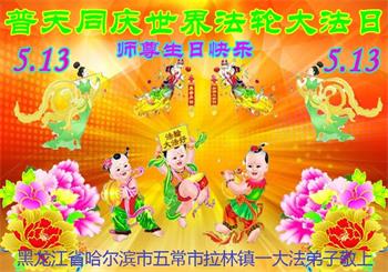 普天同庆“世界法轮大法日”,“法轮大法好”、“真善忍好” 九字吉言传洪宇。恭祝师尊生日快乐!谢师恩!弟子再精進。