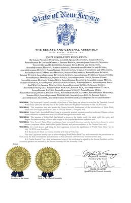 【明慧网二零一九年五月九日】在二零一九年世界法轮大法日到来之际,美国新泽西州参、众议院发表联合决议,庆贺第二十届世界法轮大法日,并赞扬法轮大法有助于改善健康,净化思想,提升心灵,表彰新泽西州法轮大法学员在本州推广法轮大法的努力。