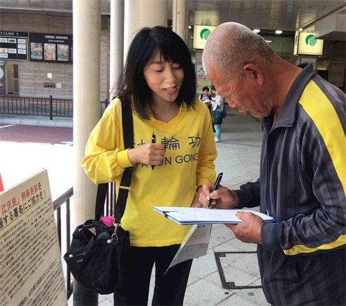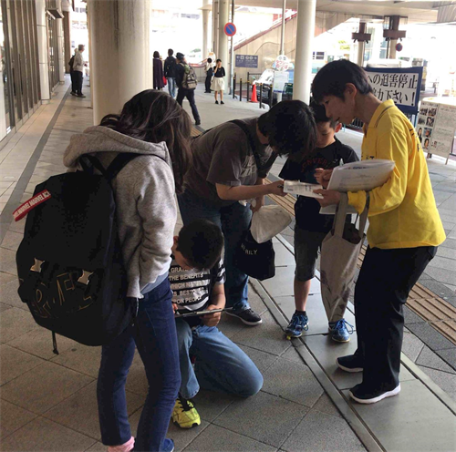 此次学员们利用五月黄金周来到了距离熊本二百公里的山口县下关市,呼吁下关民众签名举报江泽民。学员们打开横幅和真相展板,使用扩音器向行人呼吁举报江泽民的联署。有的静静的听着学员的广播说明;有的接过联署传单,很多人向学员了解更多的信息之后纷纷签名举报江泽民。