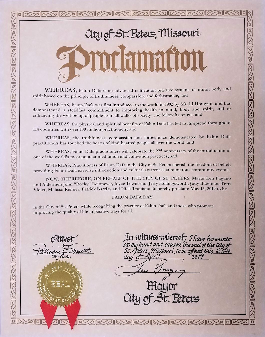 密苏里州圣彼得(St. Peters)市长蓝·帕格诺(Len Pagano)颁发褒奖,宣布法轮大法日。褒奖译文如下: