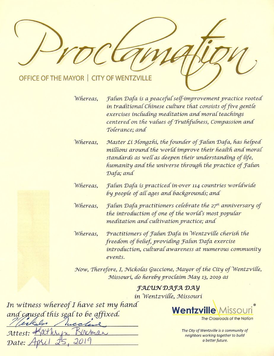 现在,鉴此,我,密苏里州温茨维尔市(Wentzville)市长尼古拉斯·古奇昂(Nickolas Guccione),宣布二零一九年五月十三日为密苏里州温茨维尔市的法轮大法日。