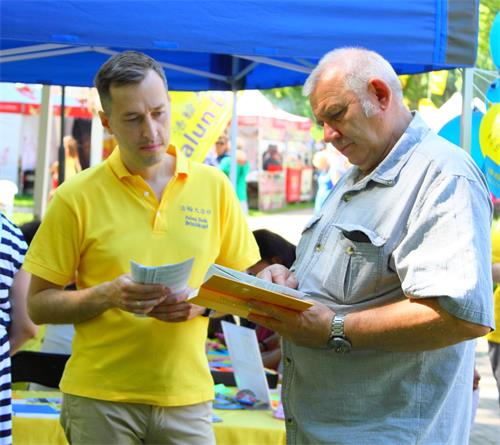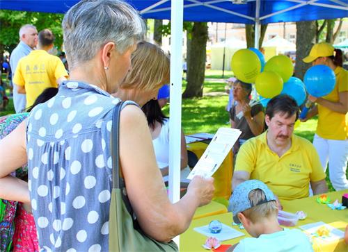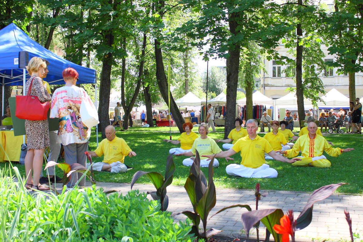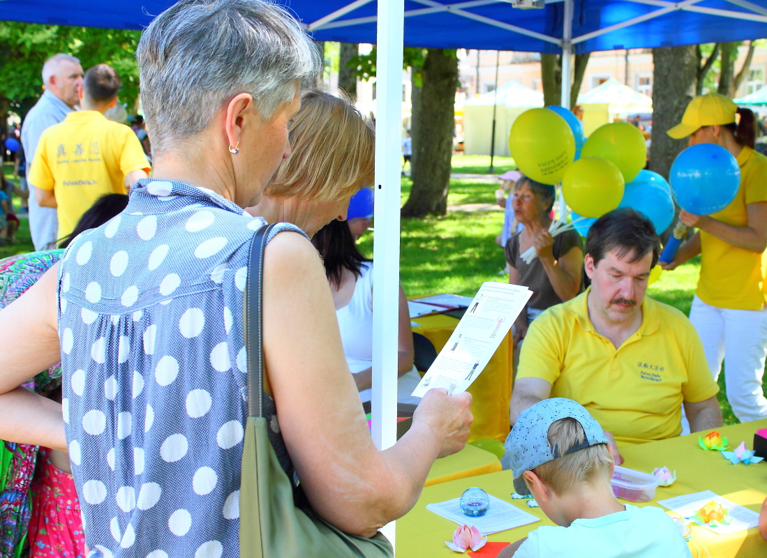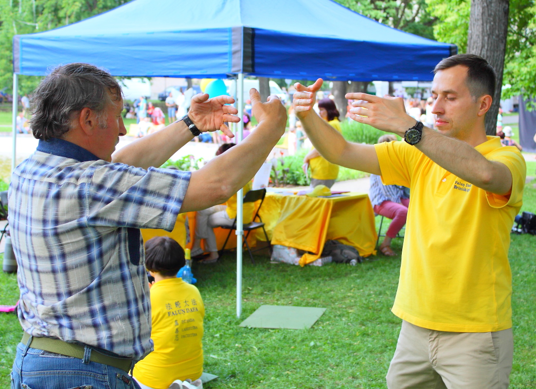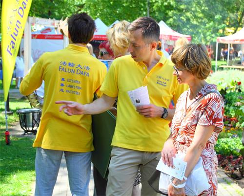 在最受欢迎的杜布罗文市公园(Dubrovin Park)里,法轮功学员搭起的帐篷,向人们介绍法轮大法的“真善忍”原则,同时,学员们还展示了五套功法。很多人利用这个机会,开始跟随学员们学功,也了解了法轮功有益于人们的身心健康。学员们还向人们讲述了自己修炼法轮大法后的故事,告诉人们自己在性格、道德方面的提升;有民众表示人们改变自己是很重要的;也有很多人对炼功点和附近的学法点很感兴趣,并询问了法轮大法网站的地址。