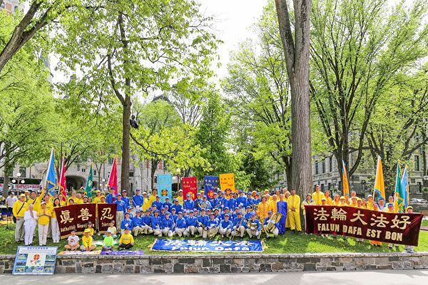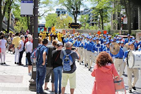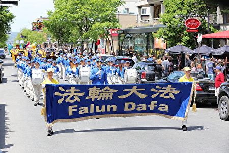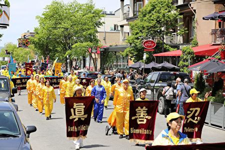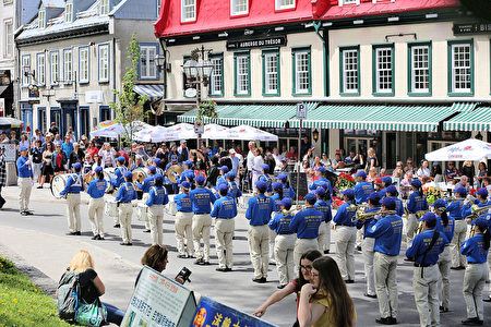 当日天气晴好,艳阳高照。中午时分,游行队伍从魁省国民议会大厦出发,途径市区主要大街René Lévesque、Grand Allée和魁北克老城。在“法轮大法”蓝色横幅引领下,天国乐团、炼功方阵和横幅方阵迤俪而行,将喜庆的气氛在这座北美知名的古城散播。